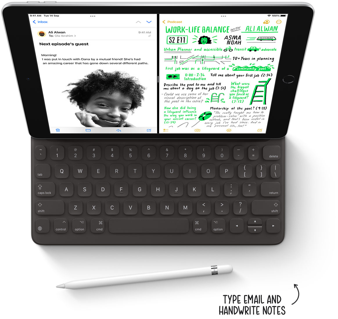 أطلق العنان لخيالك مع Apple Pencil. ابتكر عملاً فنياً وارسم ما ترى أو اكتب ما تستمع إليه. ألّف كتاباً جديداً رائعاً أو قم بإعداد تقرير أروع عن كتاب قرأته باستخدام Smart Keyboard التي تتميز بتصميمها النحيف والخفيف.