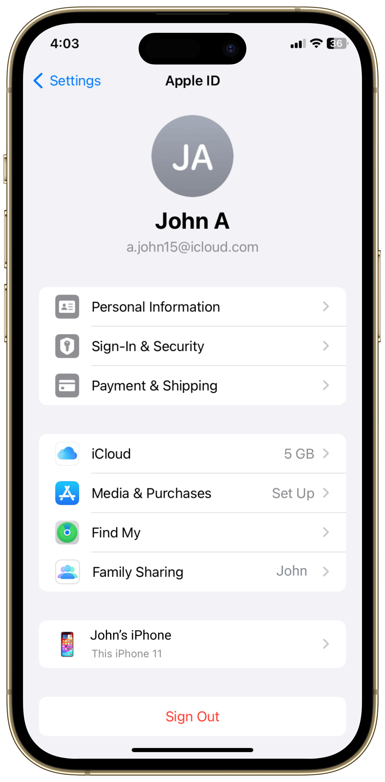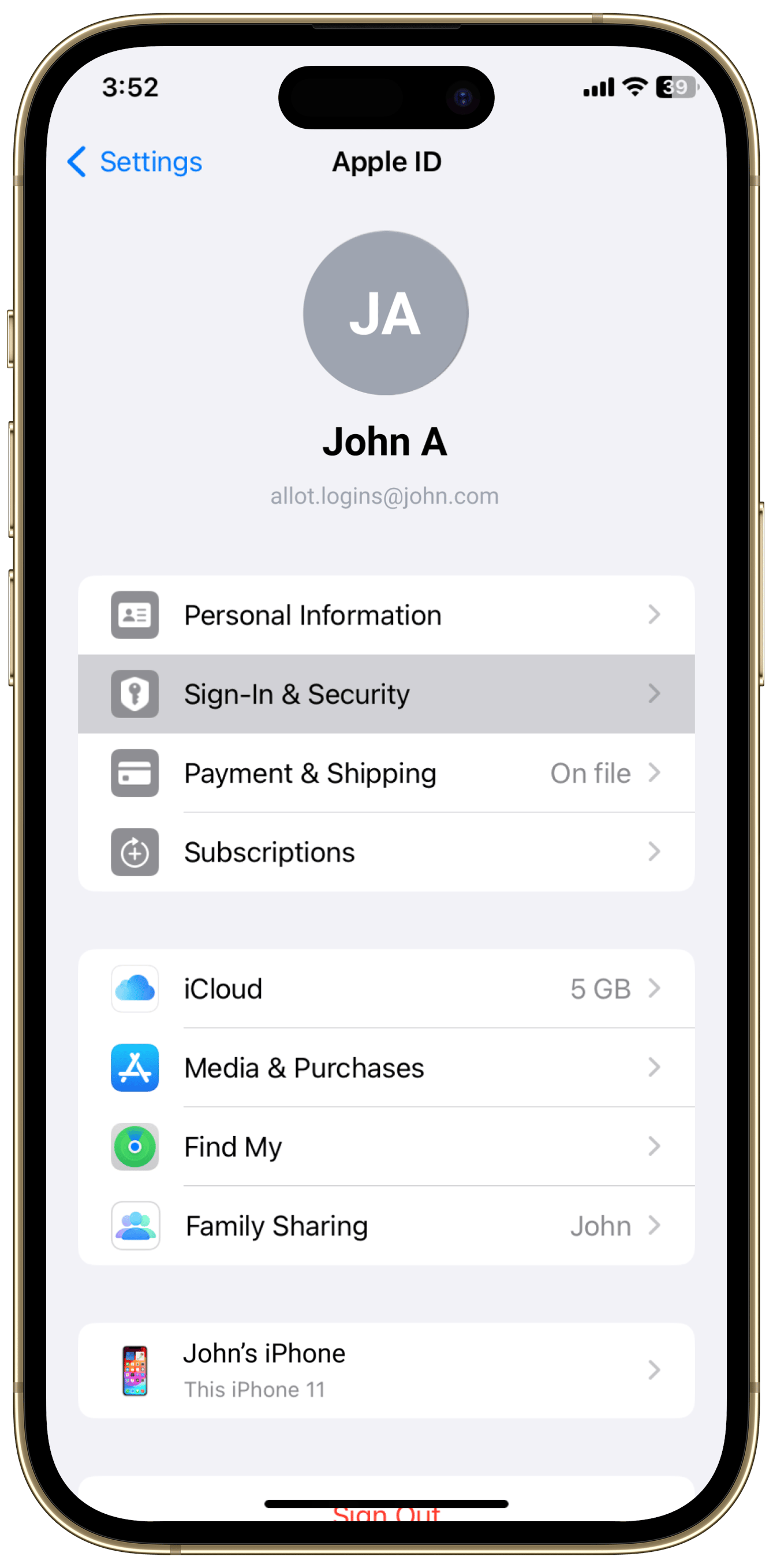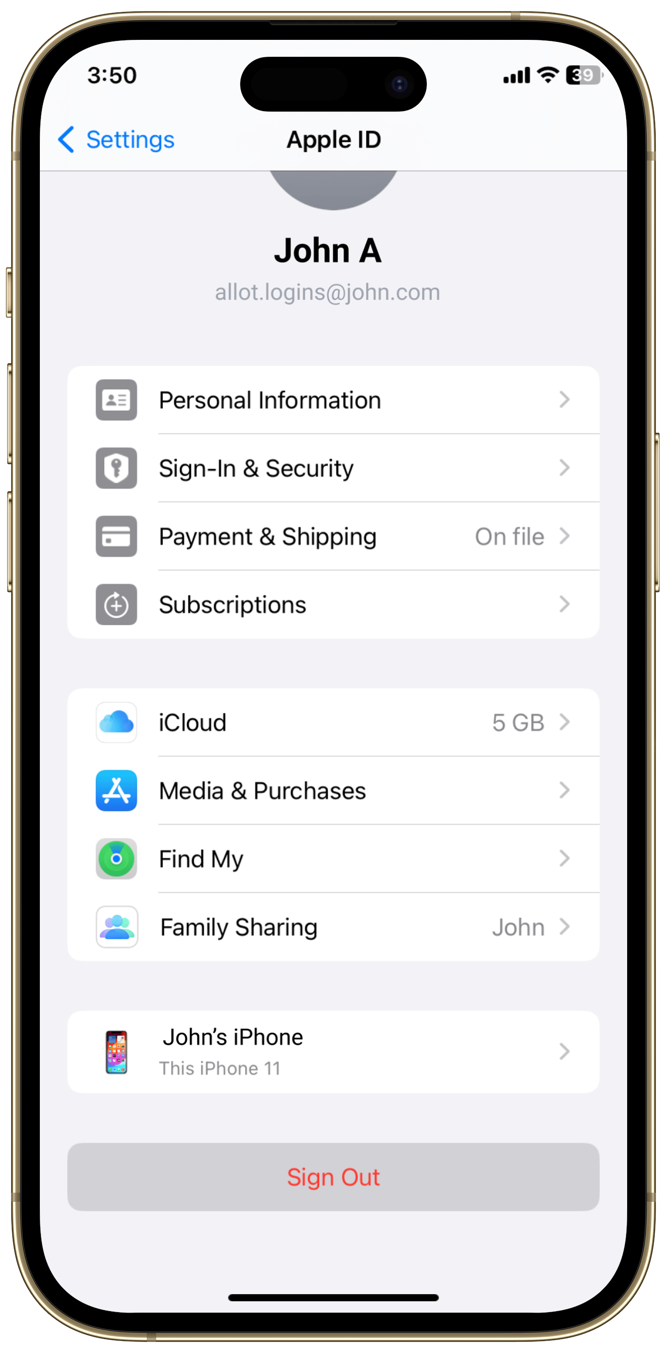 Scroll down and tap “Sign Out” from the current account.